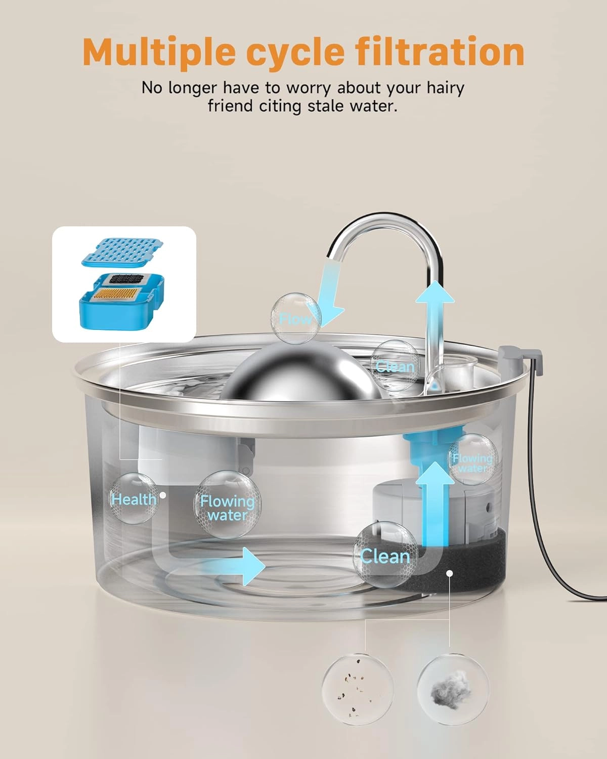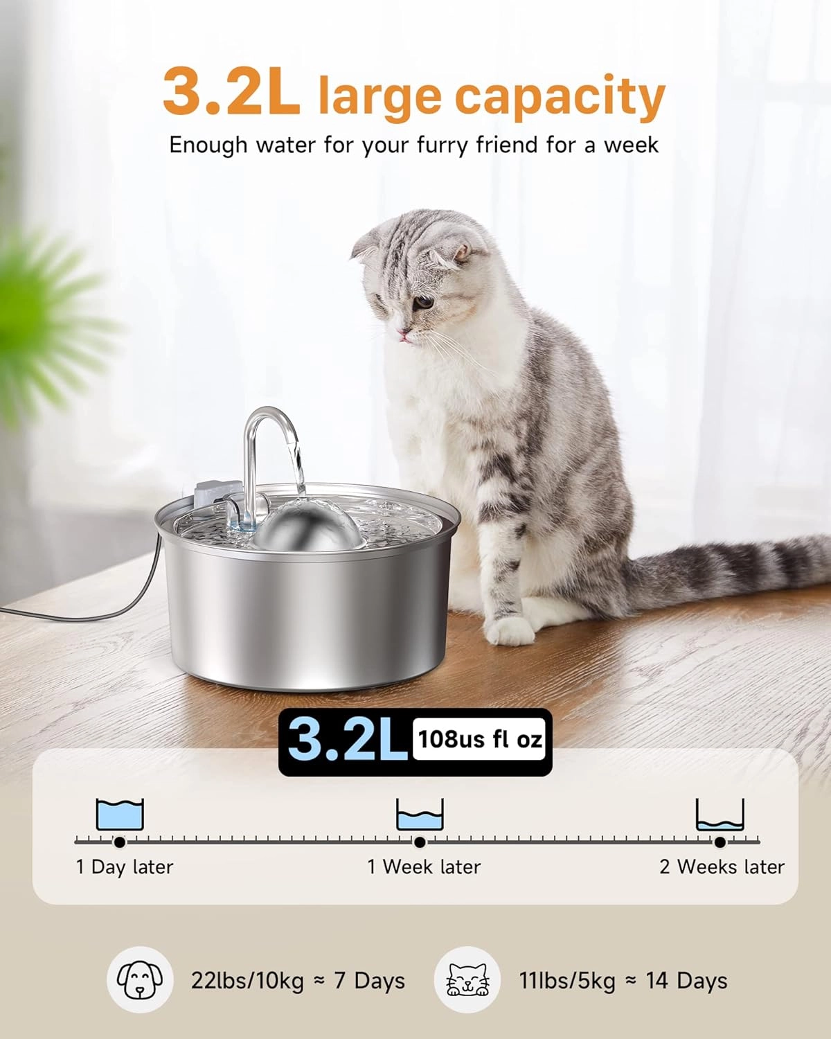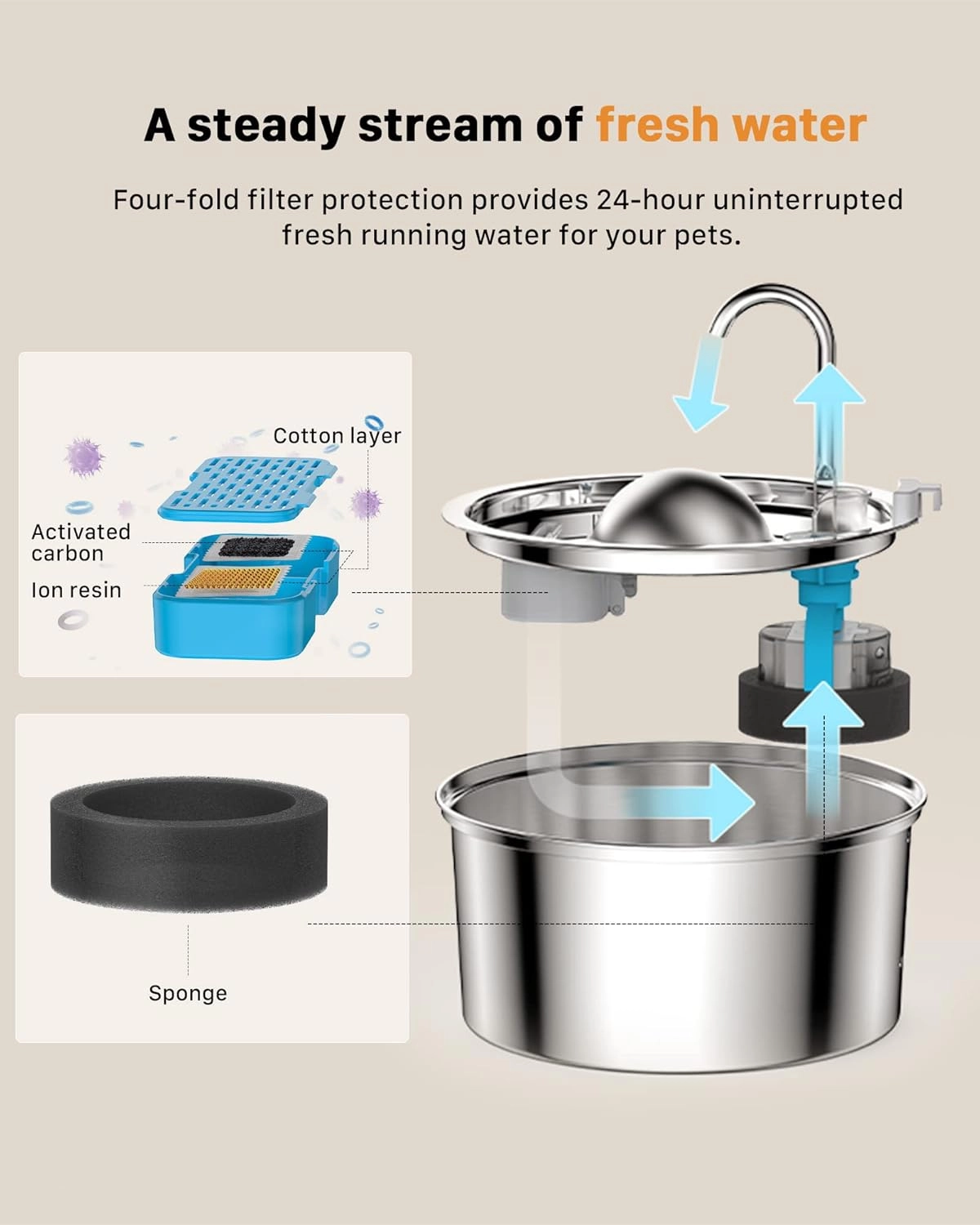 ۳. فولاد ضد زنگ 304 : آبنما از فولاد ضد زنگ مرغوب ساخته شده است که در برابر دما و سایش مقاوم و بادوام است. می توان آن را در ماشین ظرفشویی قرار داد، که نه تنها نگهداری آن آسان است، بلکه به گربه های شما اجازه می دهد تا با خیال راحت آب بنوشند.