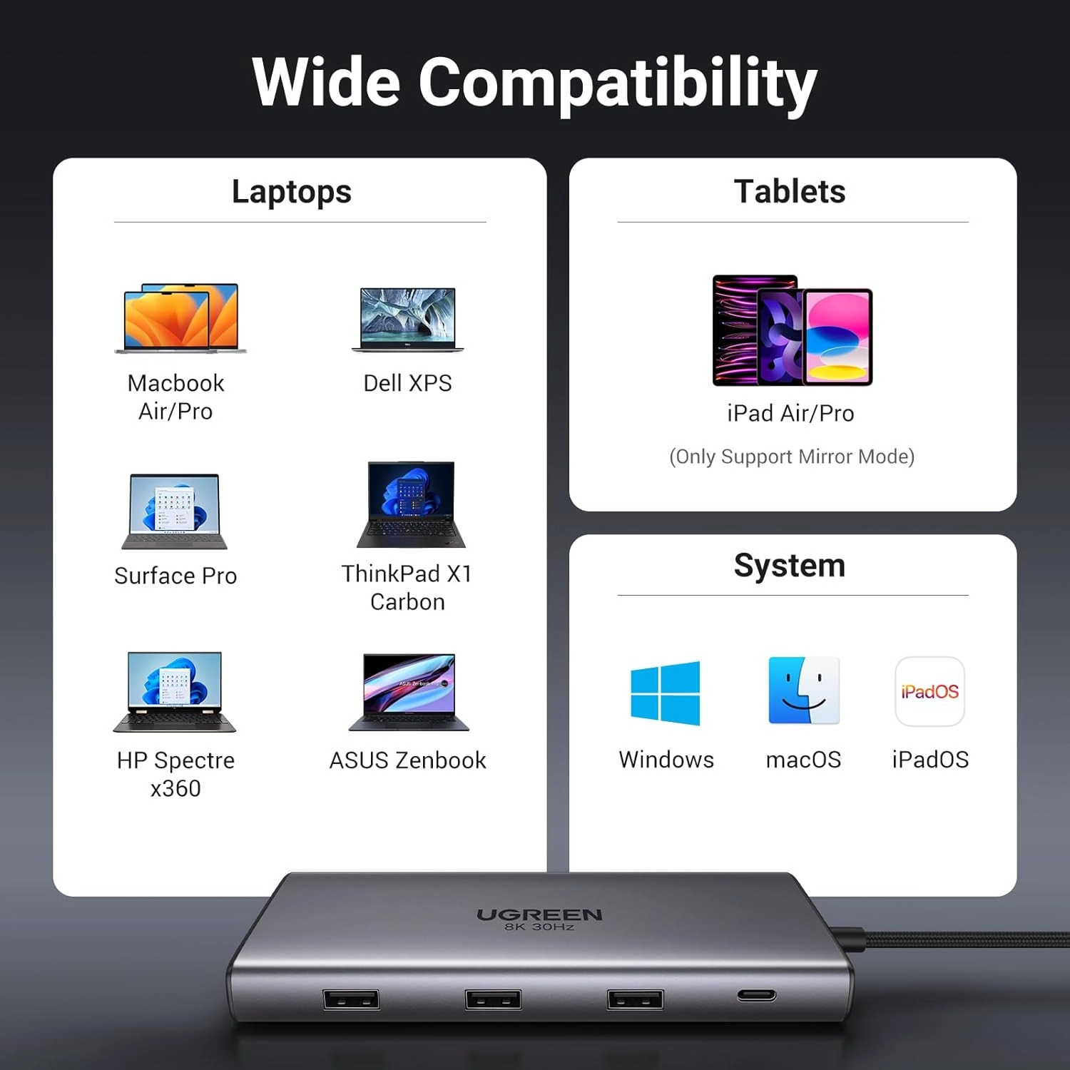 در اینجا نسخه 6 در 1 UGREEN CM498 است. با حداکثر 100 وات فناوری تحویل نیرو (PD)، مطمئناً همه دستگاههای خود را به سرعت و کارآمد تغذیه میکنید. این آداپتور از انتقال داده سریع رعد و برق (5 گیگابیت بر ثانیه) و HDMI با حداکثر وضوح 8K پشتیبانی می کند!
