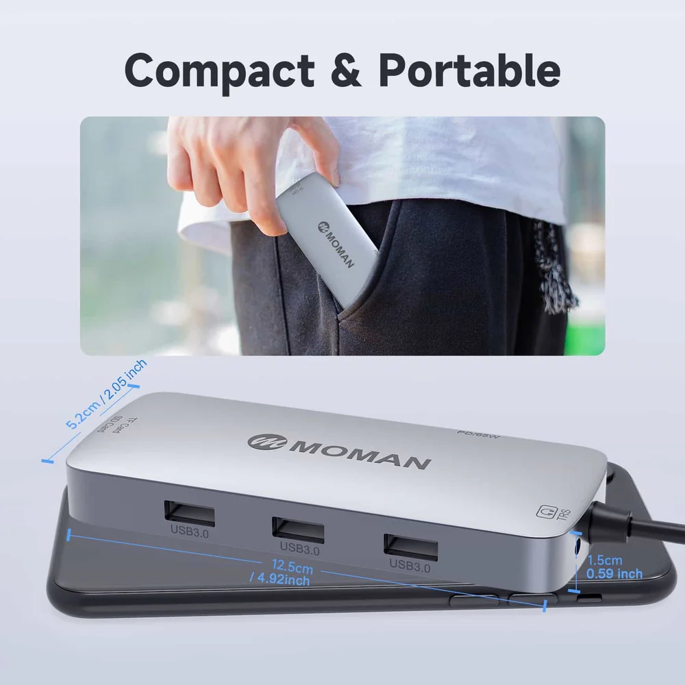 مجهز به سه پورت USB-A 3.0 با سرعت انتقال تا 5 گیگابیت بر ثانیه، هاب USB مومان انتقال داده با سرعت بالا را فراهم می کند تا اطمینان حاصل شود که فایل ها، عکس ها و فیلم های شما می توانند به سرعت منتقل شوند و از آنها نسخه پشتیبان تهیه شود.