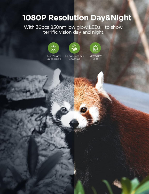 فیلتر مادون قرمز تمام اتوماتیک، ال ای دی مادون قرمز داخلی 36 عددی 850 نیوتن متری، این دوربین بازی می تواند تصاویر واضح سیاه و سفید شبانه را برای طیف وسیعی ثبت کند. این دوربین دنباله دار دارای LED های IR کم درخشندگی است که به ضبط حیوانات در شب بدون ایجاد مزاحمت برای آنها کمک می کند.
