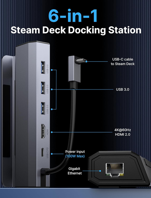 هنگام استفاده از پورت HDMI داک برای نمایش صفحه نمایش، لطفاً از کابل HDMI به HDMI استفاده کنید و از کابل ها یا آداپتورهای HDMI-to-DisplayPort خودداری کنید. توصیه میکنیم هنگام اتصال Steam Deck، آداپتور برق (۴۵ وات و بالاتر) خود را وصل کنید تا از عملکرد پایدار ویدیوی خروجی و دستگاههای خارجی اطمینان حاصل کنید.