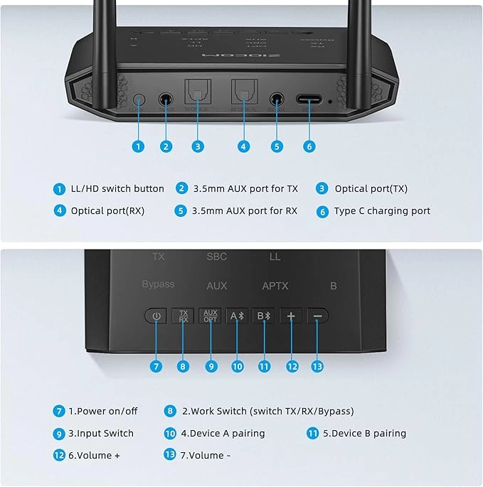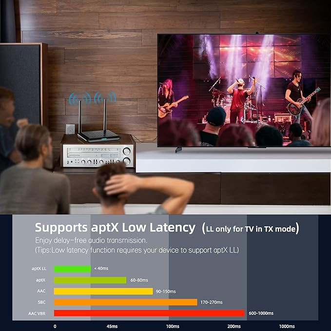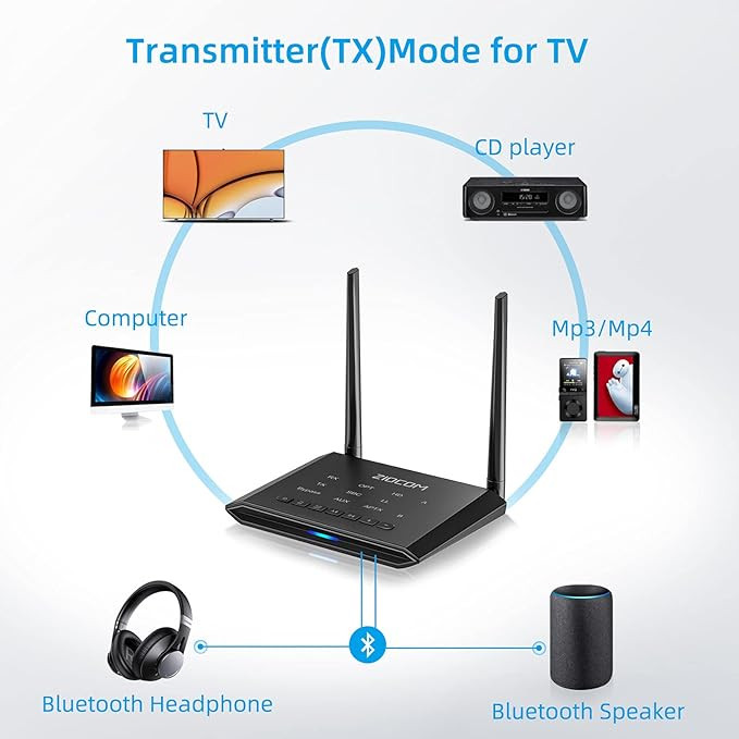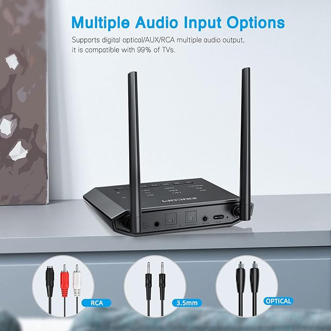 از خروجی صوتی فیبر/aux/RCA دیجیتال پشتیبانی میکند و با 99% تلویزیونها سازگار است. از افزایش و کاهش صدا برای دستگاه های بدون کنترل صدا (مانند ایرپاد) پشتیبانی می کند، همچنان از جفت کردن دو هدفون به طور همزمان پشتیبانی می کند.