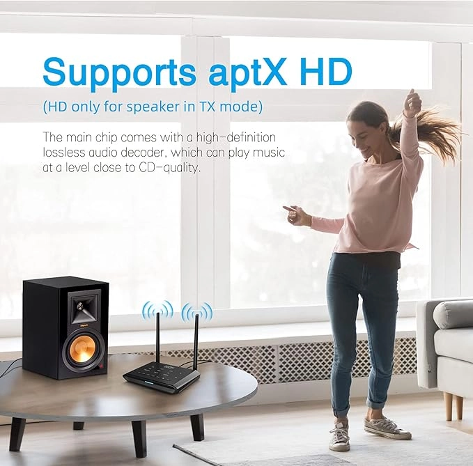 بهترین راندمان انتقال، پایداری و مصرف انرژی بسیار کم را ارائه می دهد. پشتیبانی از رمزگشایی صوتی چندگانه A2DP، AVRCP، SBC، APTX، APTX-LL و APTX-HD. با رسیور HD بدون اتلاف می تواند موسیقی را نزدیک به کیفیت صدای CD پخش کند