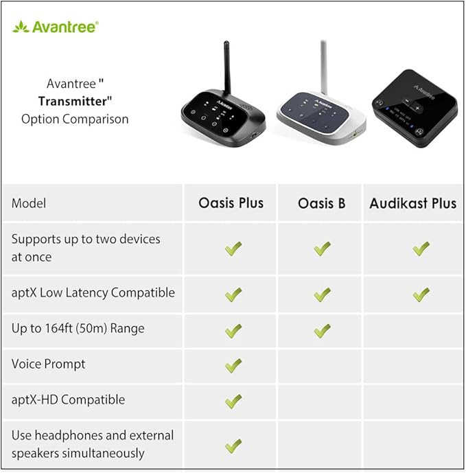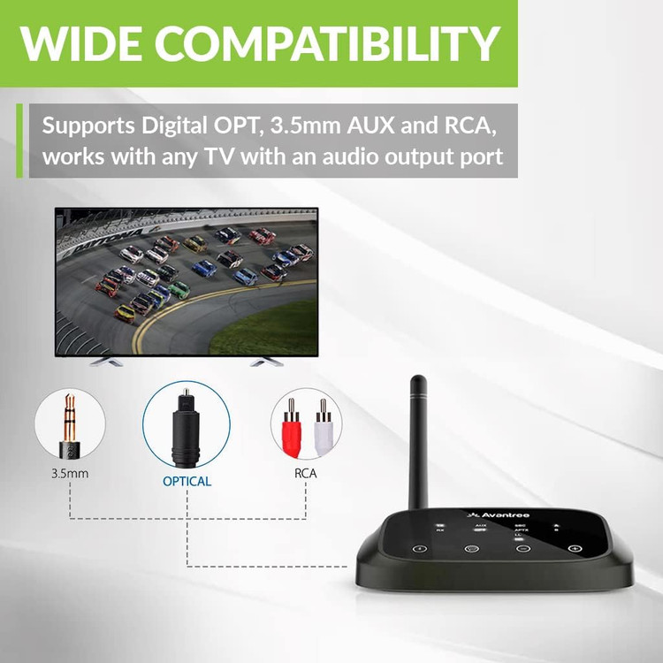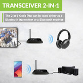 Oasis Plus از تلویزیون هایی با پورت های خروجی صوتی نوری (TOSLINK) و AUX (3.5 میلی متر) پشتیبانی می کند. لطفاً قبل از خرید گزینه های خروجی صدای تلویزیون خود را بررسی کنید تا از سازگاری اطمینان حاصل کنید. با استفاده از این محصول می توانید هدفون یا هدفون بلوتوثی را به فرستنده متصل کنید و از صدای تلویزیون خود به صورت بی سیم لذت ببرید.