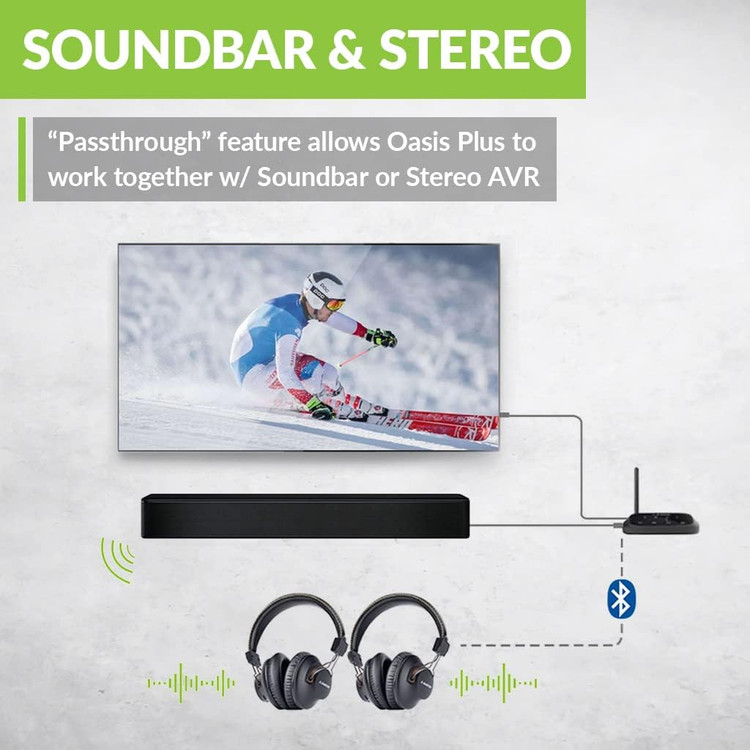 ویژگی «Pass-Through» یا «Bypass» Oasis Plus خروجی صدای همزمان را از طریق هدفون (که به Oasis Plus متصل هستند) و بلندگوی تلویزیون خارجی شما مانند Sound Bar یا Stereo AVR تضمین میکند، بنابراین اعضای خانواده همچنان میتوانند صدای تلویزیون را در حالی که شما از هدفون استفاده میکنید بشنوند.