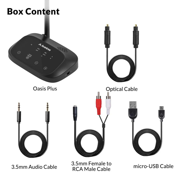 دستگاه Avantree Oasis Plus / کابل برق،داده Micro USB / کابل فیبر نوری / کابل صوتی 3.5 AUX میلی متری / کابل صوتی 3.5 AUX میلی متری به RCA / دفترچه راهنمای کاربر