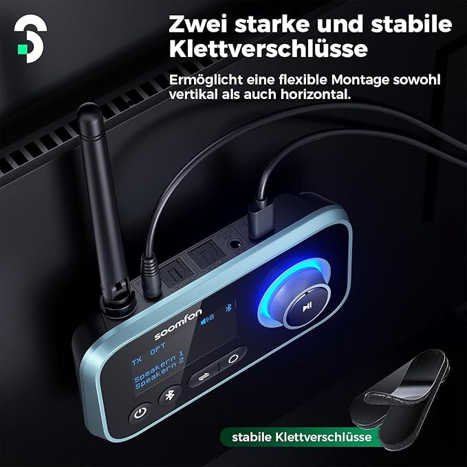 فرستنده / گیرنده / بای پس: آداپتور بلوتوث SOOMFON می تواند به عنوان فرستنده بلوتوث (حالت TX) و همچنین گیرنده بلوتوث (حالت RX) برای اتصال دستگاه های خانگی شما به صورت بی سیم از طریق بلوتوث استفاده شود. در حالت بای پس اضافی، می توانید از تلویزیون با هدفون و بلندگوهای غیر بلوتوث نیز استفاده کنید.