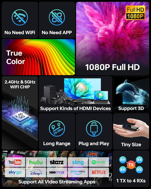 با کیتهای HDMI بیسیم Ultra HD ما، تجربه سینمای خانگی شخصی خود را بسازید و به شما امکان میدهد سریالها، فیلمها و مسابقات ورزشی زنده با کیفیت بالا را با دوستان و خانواده به اشتراک بگذارید. سازگار با برنامههای زیادی از جمله Netflix، Prime Video، Sky Go و موارد دیگر، تجربه سرگرمی شما را غنیتر میکند.