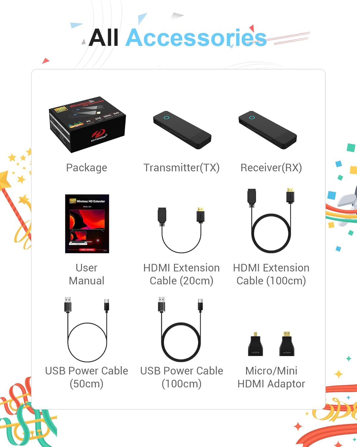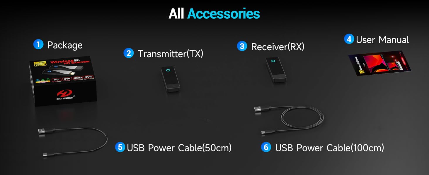 خدمات همه کاره - بسته ما شامل یک فرستنده، یک گیرنده، یک دفترچه راهنما، ۲ کابل برق و یک آداپتور micro HDMI/mini HDMI است که راحتی کاملی را برای شما فراهم میکند.