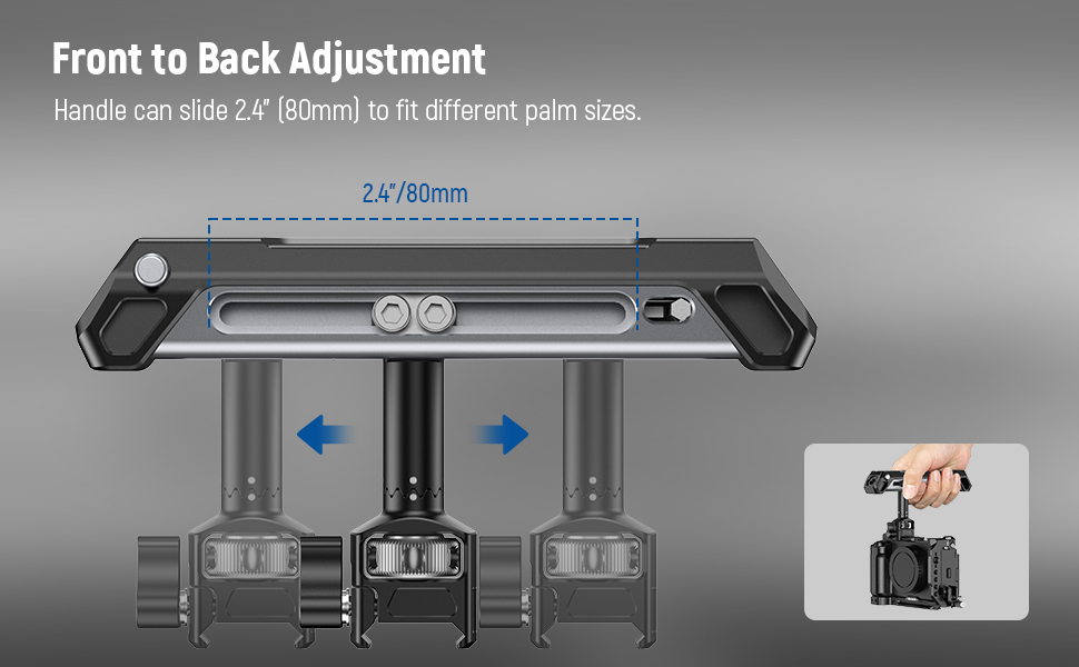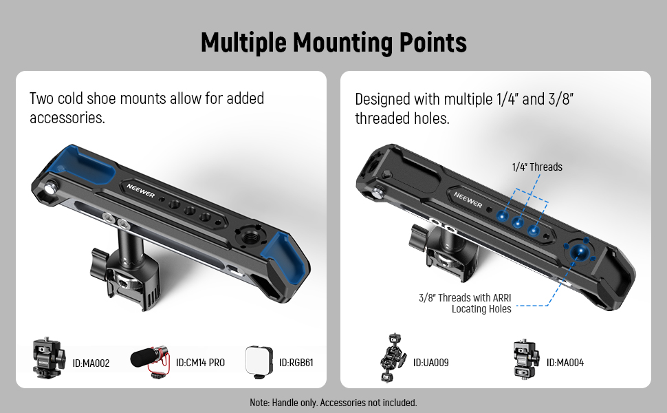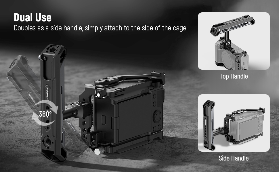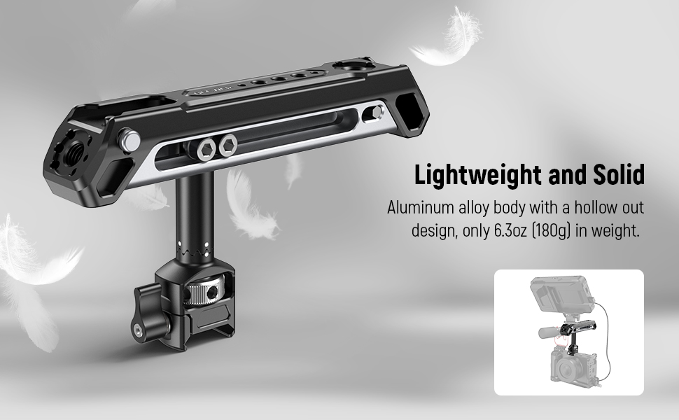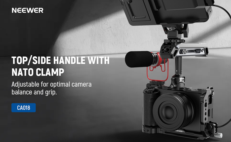 این دسته با قفسهای دوربین/تجهیزات ویدیویی SmallRig و NEEWER از طریق ریلهای یکپارچه یا خارجی ناتو (NEEWER CA011، UA003، UA007، UA022، که شامل نمیشود) سازگار است. از دکمه پیچ برای باز و بسته کردن گیره برای تنظیم دقیق و اتصال محکم استفاده کنید.