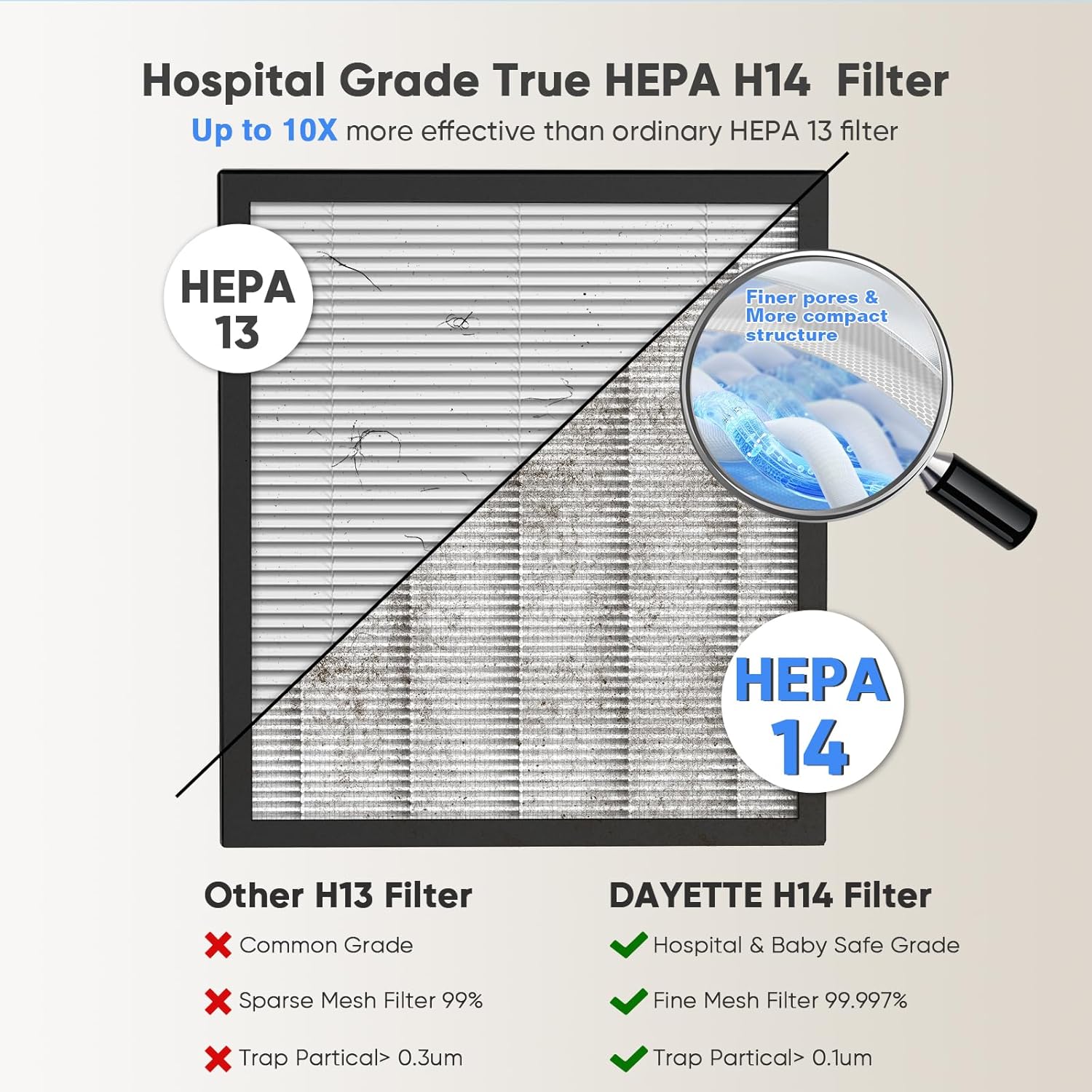 پیشفیلتر ریز قابل جدا شدن و شستشو به عنوان اولین خط دفاعی در برابر خز، شوره، مو، الیاف و ذرات بزرگتر موجود در هوا در داخل خانه عمل میکند. تمیز کردن آن با شستشو یا جاروبرقی کشیدن آسان است و به افزایش طول عمر فیلتر واقعی HEPA14 کمک میکند. ما متعهد به ایجاد محیطی سالم و راحت با فراهم کردن هوای تازه برای خانه شما هستیم. تصفیهکنندههای هوای جدید ما به فیلتر HEPA H14 ارتقا یافتهاند که میتواند ۹۹.۹۹۷٪ ذرات به کوچکی ۰.۱ میکرون را جذب کند، که کارآمدتر و قدرتمندتر از H13 است و با پیشفیلتر، فیلتر HEPA H14، فیلتر کربن فعال و فیلتر توری ترکیب شده تا به بالاترین عملکرد، مانند گرد و غبار، دود، گرده، مو و بو، دست یابد. شما میتوانید از محیطی با هوای تازهتر و تمیزتر لذت ببرید و راحتتر نفس بکشید.