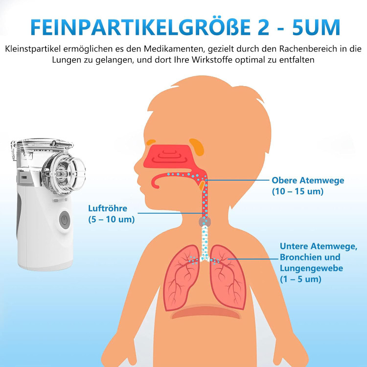 استنشاقی مخصوص بزرگسالان از فناوری اتمیزه کردن اولتراسونیک برای اتمیزه کردن داروهای محلول در آب به ذرات آئروسل کمتر از 5 میکرومتر استفاده میکند و ذرات دارو به راحتی توسط ریهها و برونشها جذب میشوند. سرعت اتمیزه کردن 0.2 میلیلیتر در دقیقه به کاربر احساس راحتی میدهد.