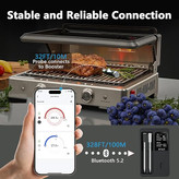دماسنج بلوتوث از فناوری پیشرفته بلوتوث ۵.۲ برای اتصال پایدارتر استفاده میکند. برد بیسیم دیجیتال دماسنج گوشت ۳۲۸ فوت است، بنابراین میتوانید پیشرفت غذای خود را روی تلفن همراه خود پیگیری کنید و این امر برای شامهای خانوادگی و دورهمیهایی که در آن آشپزی زیادی در حال انجام است، بسیار مفید است.