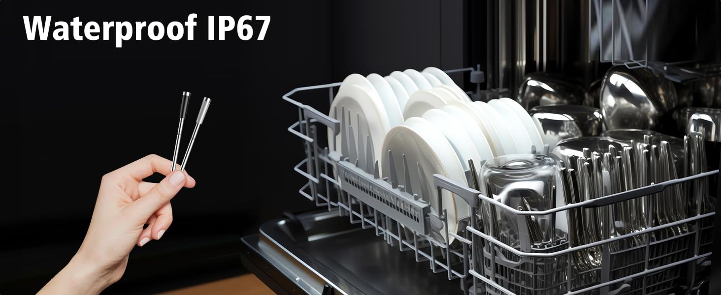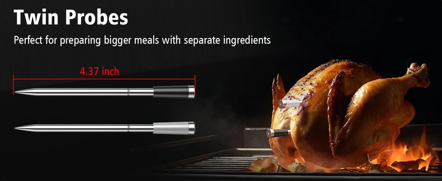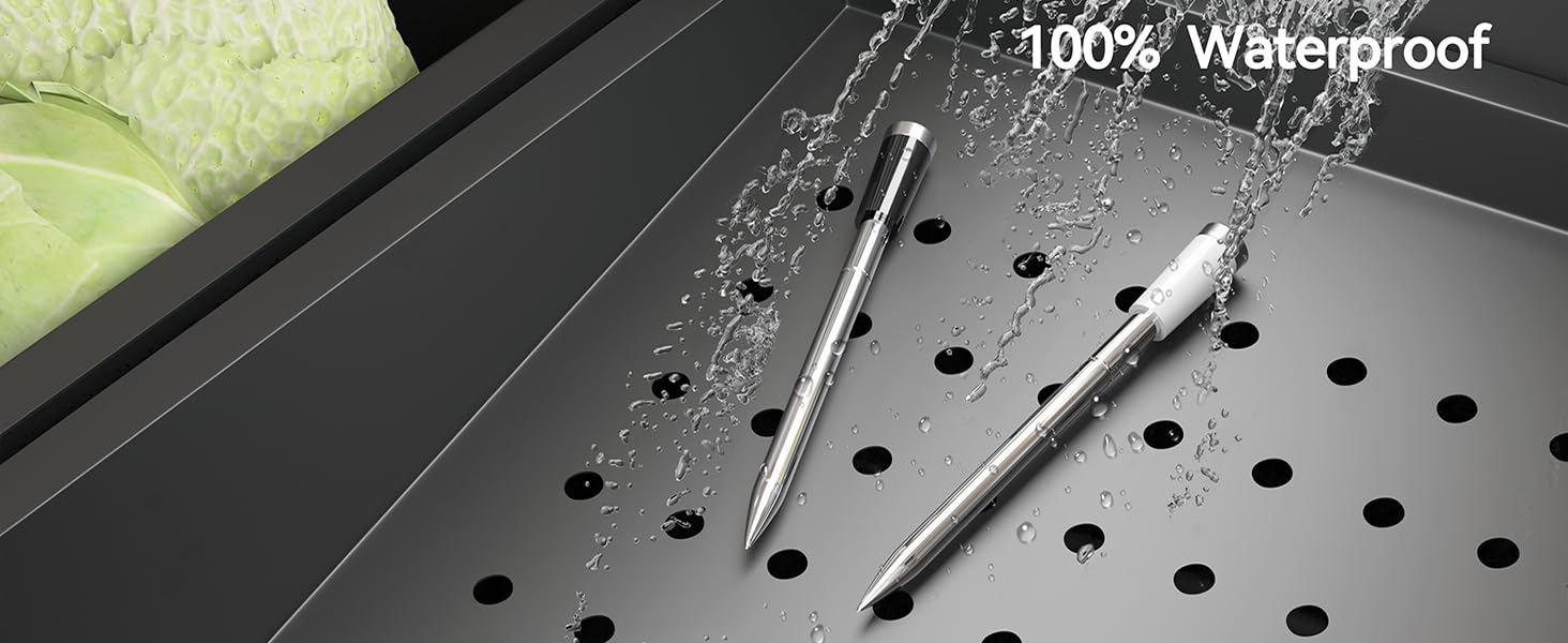 ما پرابهای دماسنج گوشت بیسیم خود را که از جنس استیل ضد زنگ درجه مواد غذایی و دسته سرامیکی زیرکونیا ساخته شده است، ارتقا دادهایم تا مقاومت در برابر حرارت، بهبود عملکرد آببندی، جلوگیری از نفوذ رطوبت به داخل پراب و افزایش موثر عمر پراب را تضمین کنیم. پرابهای دوگانه بیسیم سیاه و سفید برای ردیابی سریعتر پرابهای گوشت سیاه و سفید میتوانند زمان و دمای دو غذای مختلف را به طور همزمان کنترل کنند. لازم نیست مانند سایر دماسنجهای بیسیم کبابپز، اعداد کوچک را روی حسگرها جستجو کنید. ۱۰۰٪ بیسیم، بنابراین میتوانید با کابلهای درهمتنیده خداحافظی کنید.