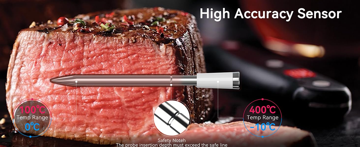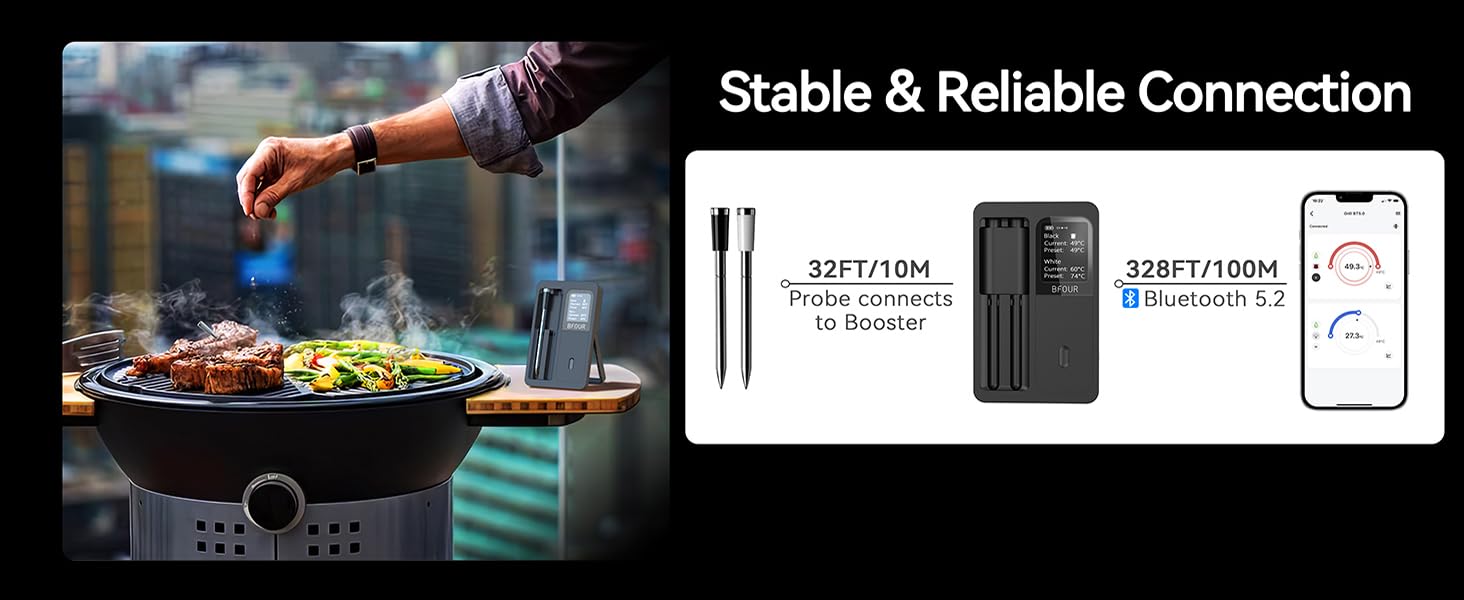 دماسنج بلوتوث از فناوری پیشرفته بلوتوث ۵.۲ برای اتصال پایدارتر استفاده میکند. برد بیسیم دیجیتال دماسنج گوشت ۳۲۸ فوت است، بنابراین میتوانید پیشرفت غذای خود را روی تلفن همراه خود پیگیری کنید و این امر برای شامهای خانوادگی و دورهمیهایی که در آن آشپزی زیادی در حال انجام است، بسیار مفید است.