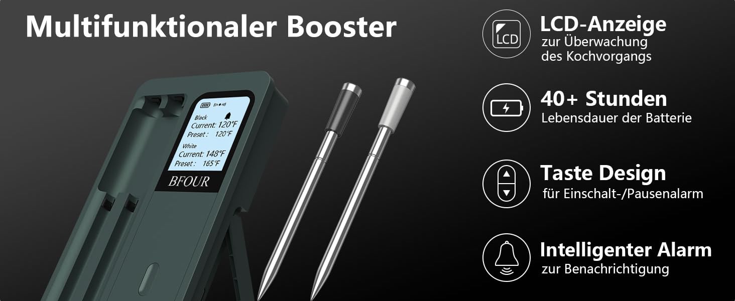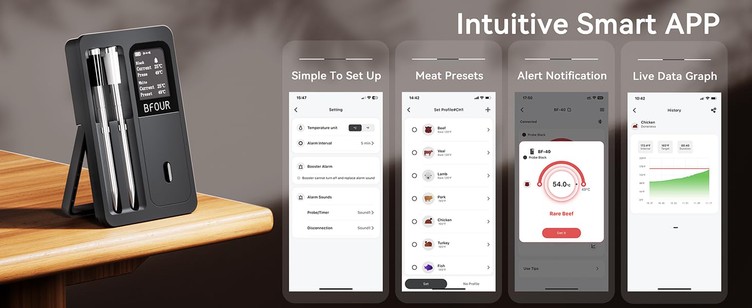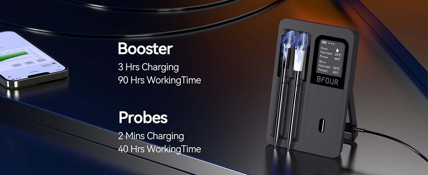 کاربرپسند: این تقویتکننده تا ۹۰ ساعت عمر باتری دارد و پروب آن در ۲ دقیقه شارژ میشود و عمر باتری ۴۰ ساعت را فراهم میکند. این دماسنج کبابپز بلوتوثی هوشمند با فرها، سرخکنها، ماهیتابهها، کبابپزها، دودیکنها و ماهیتابههای سرخکردنی سازگار است و هدیهای ایدهآل برای طرفداران کبابپز و سرآشپزها در خانه است.