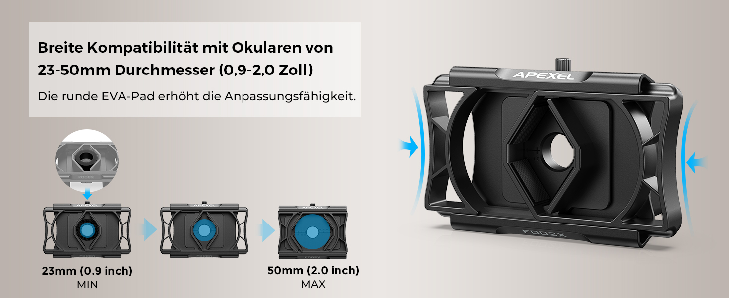 - آداپتور جهانی APEXEL برای دوربینهای چشمی با قطر خارجی ۲۳ میلیمتر تا ۵۰ میلیمتر مناسب است و میتواند روی اکثر دوربینهای دوچشمی، دستگاههای تکچشمی، تلسکوپها و دوربینهای چشمی، میکروسکوپها نصب شود (اگر چشمی دستگاه نوری کوچک است، میتوانید آنها را در بسته قرار دهید. فاصلهدهنده EVA برای اتصال آنها به چهار گوشه آداپتور)