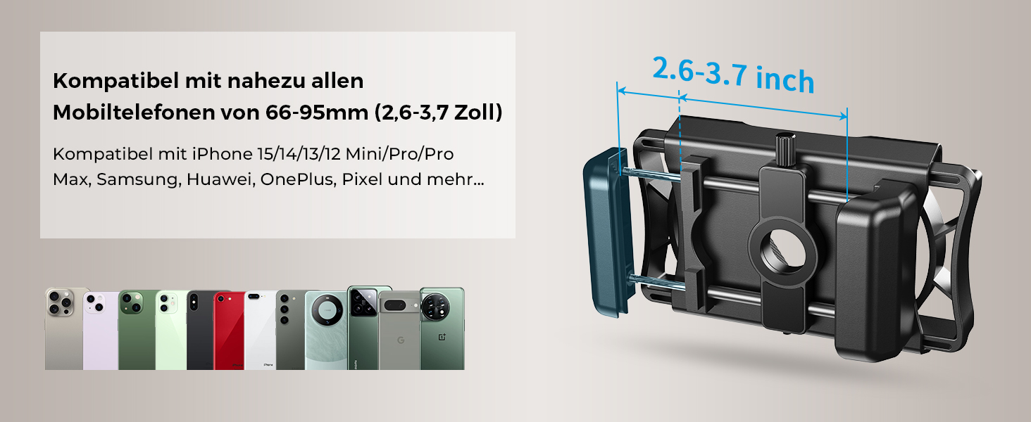 - براکت آداپتور جهانی برای تلفنهای همراه با طیف وسیعی از عرضها از ۶۶ میلیمتر تا ۹۵ میلیمتر، عمق ۶.۵ میلیمتر تا ۱۴ میلیمتر. مناسب برای بیش از ۹۹٪ مدلهای تلفنهای هوشمند. (برای گوشیهایی با چند لنز، فقط لنز اصلی گوشی باید متصل شود.)