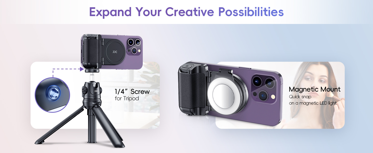 قسمت پشتی گیره گوشی سلفی به شما امکان میدهد لوازم جانبی مانند چراغ LED مغناطیسی یا سه پایه مغناطیسی (که جداگانه فروخته میشود) را نصب کنید. علاوه بر این، یک پیچ سه پایه 1/4 اینچی در پایین به شما امکان میدهد گیره گوشی را روی سه پایه نصب کنید و امکانات خلاقانه خود را گسترش دهید.