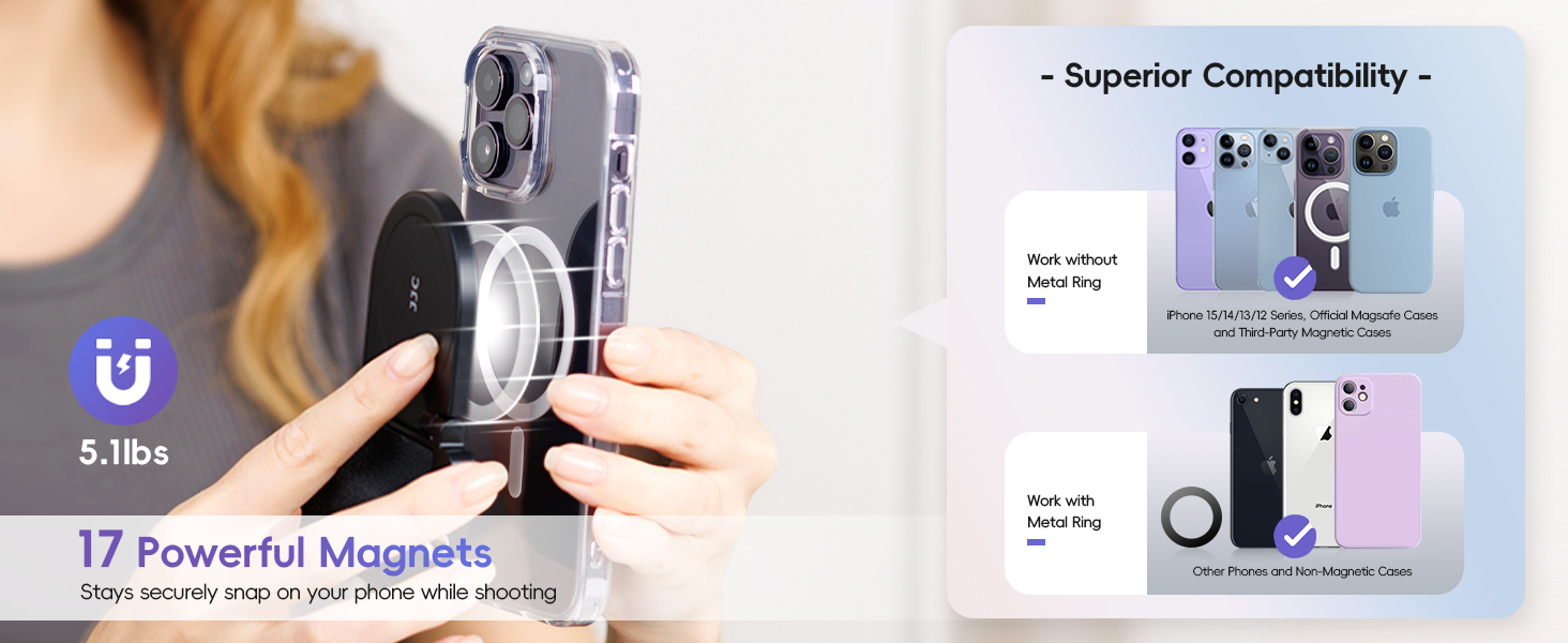این دسته گوشی مغناطیسی با نیروی مغناطیسی تا ۵.۱ پوند / ۲.۳ کیلوگرم، مستقیماً به آیفون ایر، سری آیفون ۱۷، سری آیفون ۱۶، سری آیفون ۱۵، سری آیفون ۱۴، سری آیفون ۱۳، سری آیفون ۱۲، قابهای رسمی و شخص ثالث Magsafe یا سایر گوشیهای دارای حلقه فلزی متصل میشود. این تضمین میکند که دستگاه شما بدون لغزش در جای خود محکم بماند.