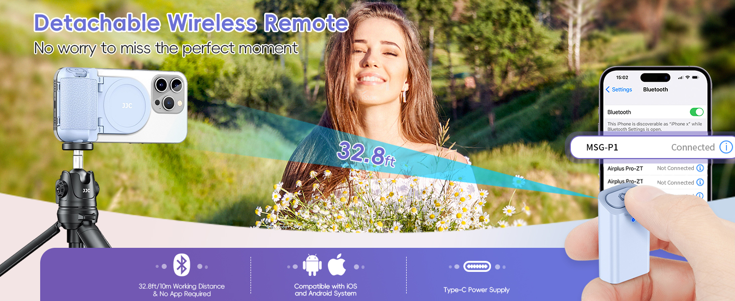 ریموت بیسیم قابل جدا شدن فوراً با گوشیهای هوشمند iOS و اندروید جفت میشود و نیازی به برنامه اضافی ندارد. این ریموت به شما امکان میدهد به راحتی از فاصله تا 32.8 فوت سلفی یا عکسهای گروهی بگیرید. این ریموت دارای یک باتری داخلی است که به راحتی با کابل Type-C موجود قابل شارژ است. توجه* ریموت از عملکرد زوم پشتیبانی نمیکند.