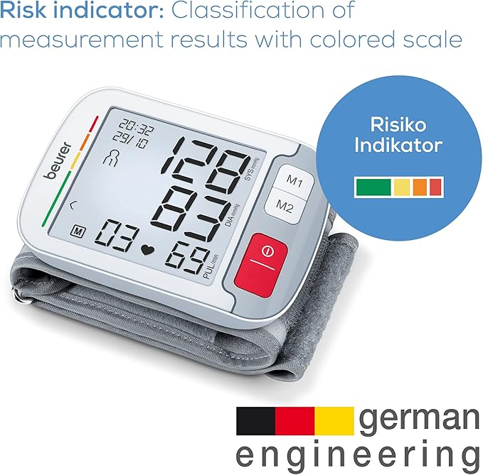 با دستگاه فشار خون مچی Beurer BC51، میتوانید به سرعت و به راحتی فشار خون خود را با دقت اندازهگیری کنید. به لطف نشانگر موقعیتیابی یکپارچه، میتوانید مطمئن باشید که از دستگاه به درستی استفاده میکنید و به عدد اندازهگیری شده خود اطمینان دارید. صفحه نمایش بزرگ، ارقام را به راحتی میخواند و نشانگر خطر WHO با کد رنگی به شما این امکان را میدهد که در صورت وجود هرگونه نگرانی، با یک نگاه متوجه شوید.