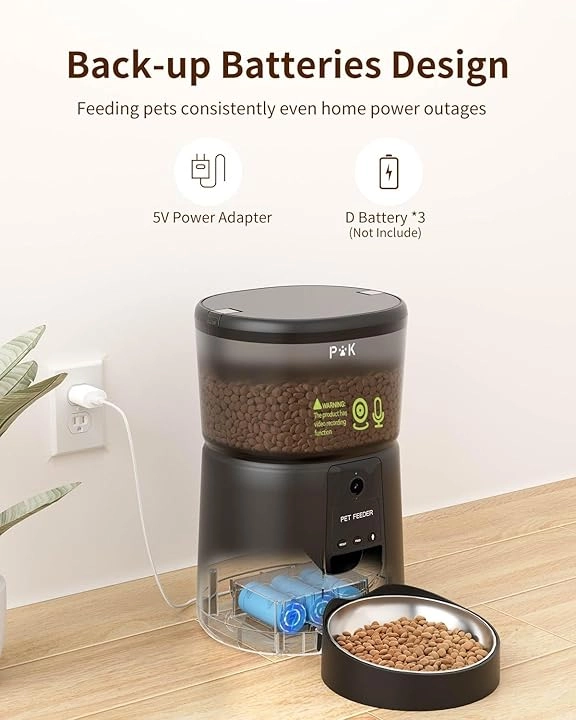 ۱۱. منبع تغذیه دوگانه: تغذیه گربه و سگ اتوماتیک توسط یک آداپتور ۵ ولت یا باتری های ۳ بعدی تغذیه می شود. توصیه می شود هم از باتری و هم از آداپتور استفاده کنید تا حیوان خانگی شما حتی در صورت قطع برق یک وعده غذایی را از دست ندهد. برنامه تغذیه نیازی به تنظیم مجدد در هنگام بازیابی منبع تغذیه ندارد. درپوش مخزن، مخزن و کاسه تغذیه سگ فیدر اتوماتیک برای تمیز کردن کامل قابل جدا شدن است. ساختار پیشرفته چرخش اتوماتیک و طراحی سطح شیبدار دهانه خروجی مشکل گرفتگی را حل می کند