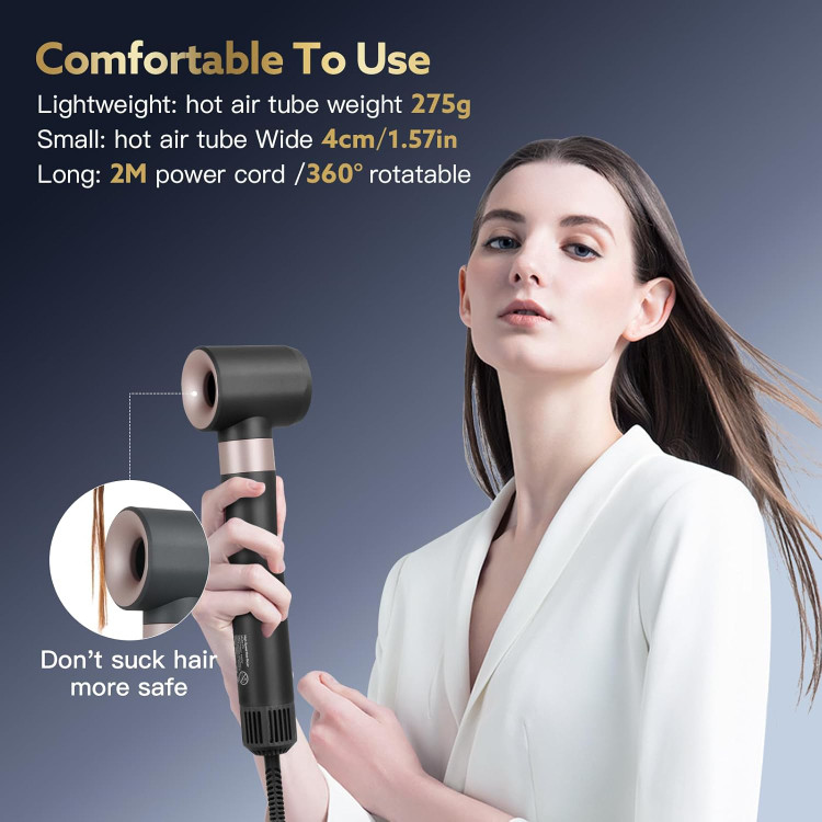 [خشک کردن سریع] با موتور پرسرعت brushless و قدرت 1400 وات، سشوار حرفه ای می تواند به سرعت 110000 دور در دقیقه و 20 متر بر ثانیه برسد، جریان هوای قوی سشوار می تواند موها را به سرعت در 10-1دقیقه خشک کند، در حالی که تولید صدای کمتر (<78 دسی بل) در مقایسه با سشوارهای سنتی و خطر مکیدن مو توسط سشوار را ندارد. با این سشوار می توانید در زمان بیشتری صرفه جویی کنید!
