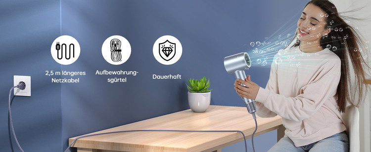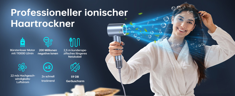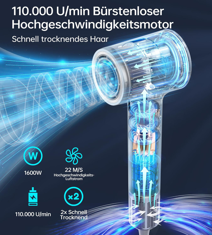 موتور 110000 دور در دقیقه و خشک کردن سریع : موتور سشوار 110000 دور در دقیقه سرعت جریان هوای 22 متر بر ثانیه را برای خشک کردن قوی تولید می کند و از خشک شدن سریع موها در خانه در نصف زمان سشوارهای معمولی اطمینان حاصل می کند. جریان هوای قدرتمند موهای کوتاه را تنها در چند دقیقه خشک می کند.