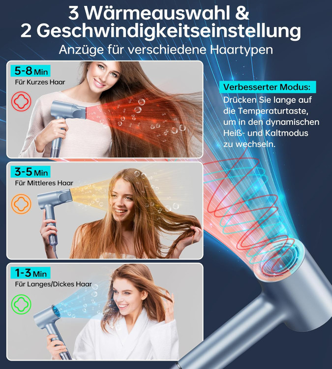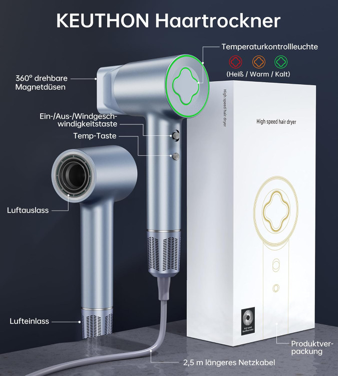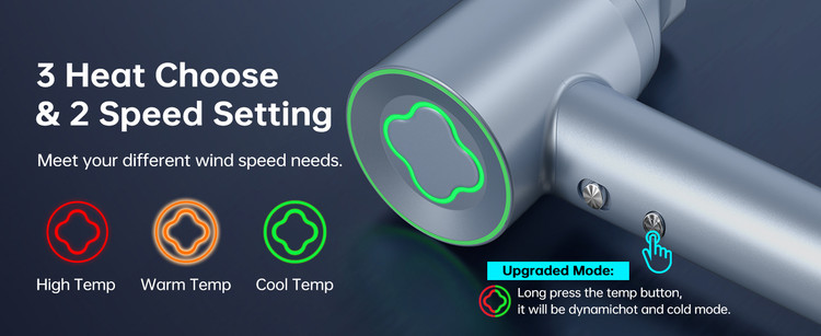 4 درجه حرارت و 2 سرعت: سشوار KEUTHON دارای 4 تنظیم دما و 2 سرعت هوا برای انتخاب است. نشانگرهای LED بسته به دما نورهای مختلفی را نشان می دهند. حالت ارتقا دکمه دما را برای وارد شدن به حالت سرمایش و گرمایش دینامیکی فشار دهید. شما می توانید به راحتی موهای خود را بدون نیاز به تغییر دستی بین حالت گرم و سرد خشک کنید.