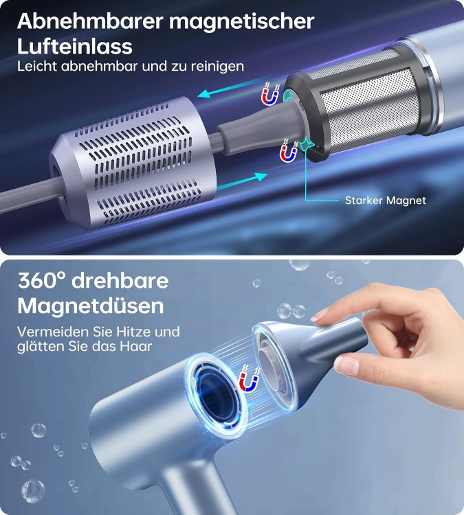 طراحی منحصر به فرد ارتقا یافته: نازل مغناطیسی چرخشی 360 درجه برای یک ظاهر طراحی دقیق روی موهای صاف و صاف ایده آل است. توری فیلتر محکم بافته شده در داخل ورودی هوای سشوار متصل می شود، از موهای مجعد محافظت می کند و از آسیب رسیدن به هوا و مکیدن مو جلوگیری می کند.