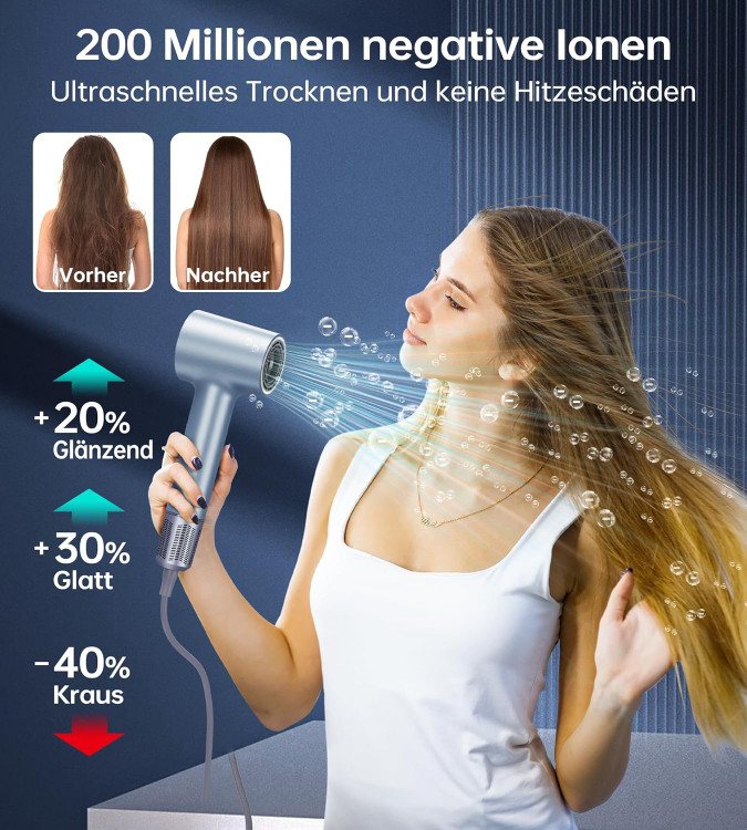 200 میلیون یون منفی: در مقایسه با سشوارهای معمولی، این سشوار یونی میلیاردها یون منفی آزاد می کند که کوتیکول مو را می بندد، موخوره را رام می کند، موهای آسیب دیده را ترمیم می کند و رطوبت را برای موهایی صاف و حجیم می کند. تراشه کنترل دما هوشمند، مو را صاف نگه می دارد تا از آسیب دمای بالا به مو جلوگیری کند.