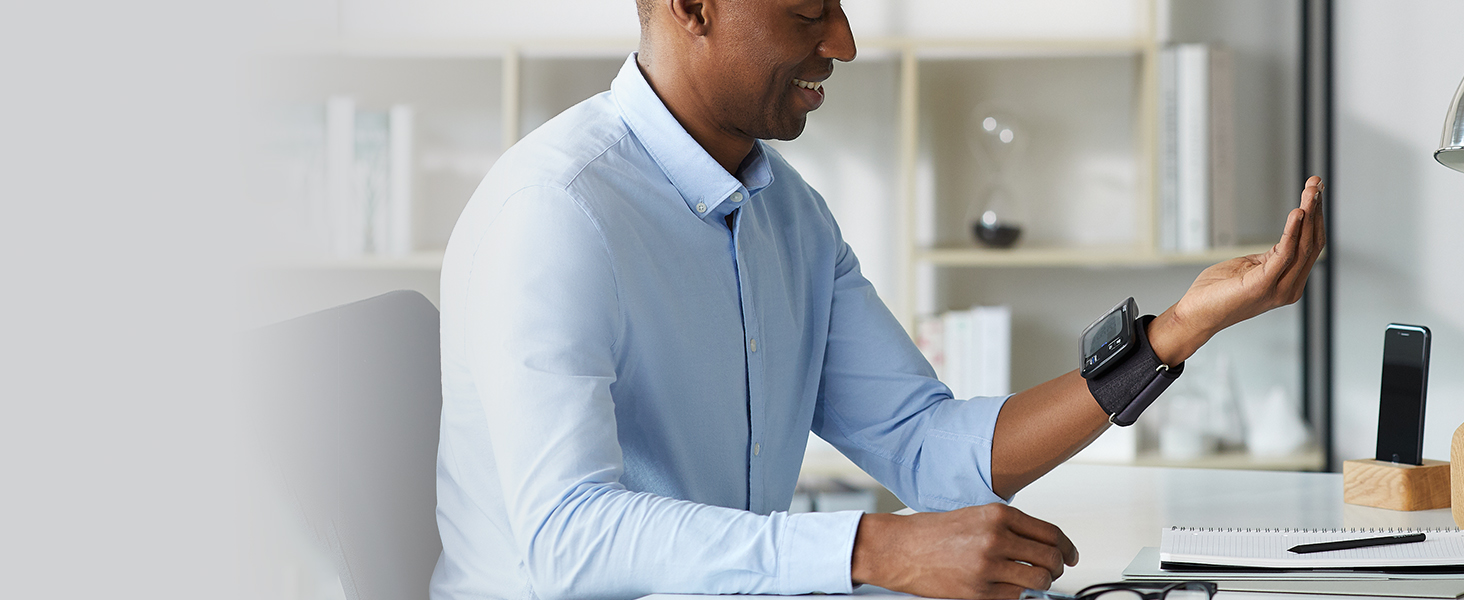 - همانطور که دستگاه را روی مچ خود قرار میدهید، راهنمای بستهبندی کاف به شما اطلاع میدهد که دستگاه را به درستی بستهاید. و حسگر موقعیتیابی نشان میدهد که چه زمانی در موقعیت مناسب برای گرفتن مقدار دقیق فشار خون قرار دارد.